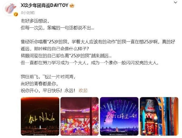 4月26日晚,肖战发文谈看了偶像孙燕姿的演唱会,他说曾经听着她的歌想象未来“25岁的自己”,现在离25岁越来越远,“一直都在努力学习成为一个大人,成为一个像你一般闪闪发亮的大人”,“尚好的青春都是你,祝你开心,平日快乐!永远!”