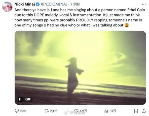 麻辣鸡Nicki Minaj哼唱Lana新曲片段,盛赞其音乐表现力