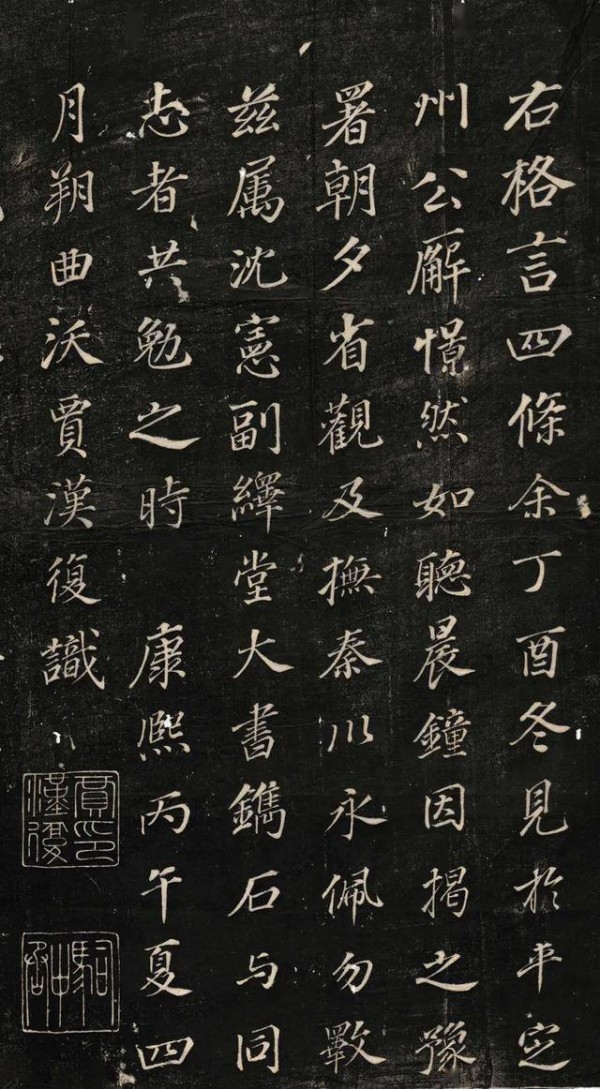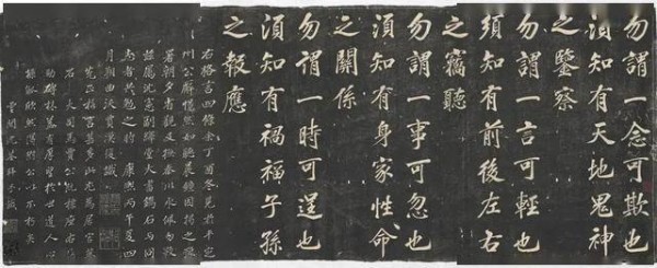 此书是在清康熙五年的四月份所刻成的,原碑现在保存在陕西西安的碑林博物馆里,妥妥的珍贵文物。碑上的文字主要讲的是做人做事的道理:不管是说话还是行动,都得小心谨慎,哪怕是特别小的事也不能随便应付;还要时刻留意自己心里的想法,既不能骗别人,更不能自欺欺人,简单说就是要 “言行走心、表里如一”。
