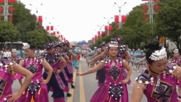 在湖北恩施来凤县,近两千名土家儿女沿街而行,脚踏鼓点,跳起国家级非物质文化遗产代表性项目——土家族摆手舞。大家用舞蹈传递节日的欢庆氛围,为新中国华诞祝福。