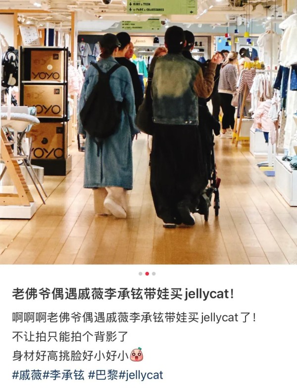 这次巴黎行,应该主要是因为戚薇要去看秀,一个星期前就有网友在老佛爷偶遇戚薇李承铉带娃买jellycat,夫妇俩身材气质很好。