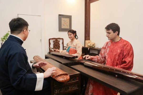 雅集现场,还迎来了一群特殊的参与者——来自越南、泰国、约旦、孟加拉国、印度尼西亚、俄罗斯、波兰、埃及、老挝等国家的40余名四川大学国际学生。国际学生们刚走进庭院,便被动听的旋律吸引,纷纷拿出手机记录这充满东方韵味的场景。在互动体验环节,他们更是热情高涨,纷纷围拢到琴案旁,在琴师的指导下尝试拨动琴弦。