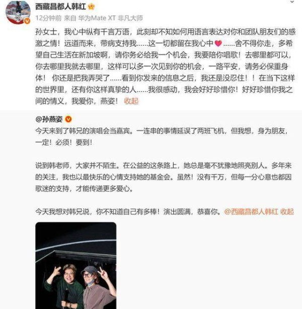 10月7日晚,孙燕姿晒出和韩红的合照写道:“今天来到了韩兄的演唱会当嘉宾。一连串的事情延误了两班飞机,但我想,身为朋友,一定!必须!要到!说到韩老师,大家并不陌生。在公益的这条路上,她总是毫不犹豫地照亮别人。多年来的关注,我也以最快乐的心情支持她的基金会。虽然!没有千万,但每一分心意也都因歌迷的支持,才能传递更多爱心。今天我想对韩兄说,你不知道自己有多棒!演出圆满,恭喜你。”
