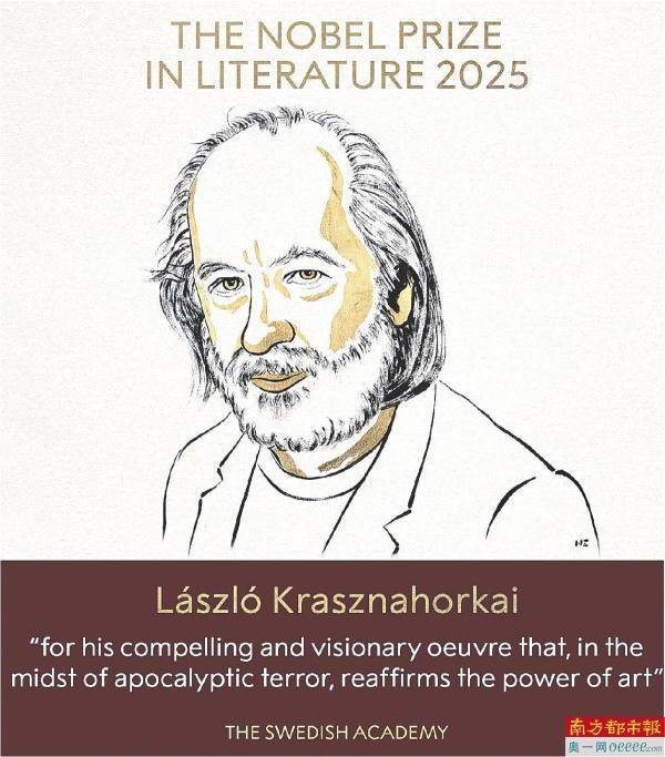10月9日,2025年诺贝尔文学奖在瑞典文学院颁出,匈牙利作家拉斯洛·克拉斯诺霍尔卡伊(Laszlo Krasznahorkai)折桂。颁奖词称:“因他的极具说服力和预见性的作品,在末世般的恐惧中,重新确立了艺术的力量。”