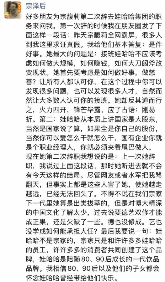 宗泽后发文回应宗馥莉辞职称其锋芒毕露刚易折宗庆后称宗馥莉比自己厉害