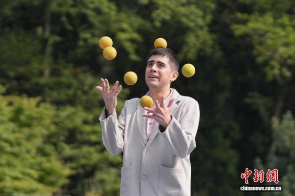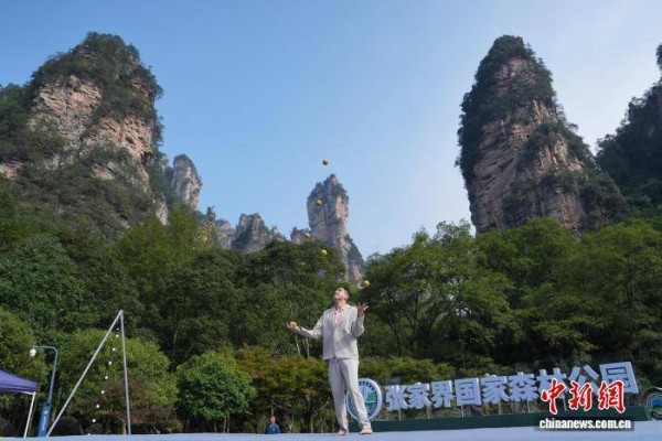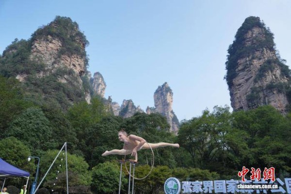 10月12日,在湖南张家界举行的2025张家界国际新杂技戏剧周上,来自俄罗斯、德国、智利等国家和地区的演员在峰林中表演杂技,杂技动作与奇峰景观相融合,吸引众多游客围观。图为来自德国的演员表演杂技《手平衡呼啦圈》。中新社记者 杨华峰 摄