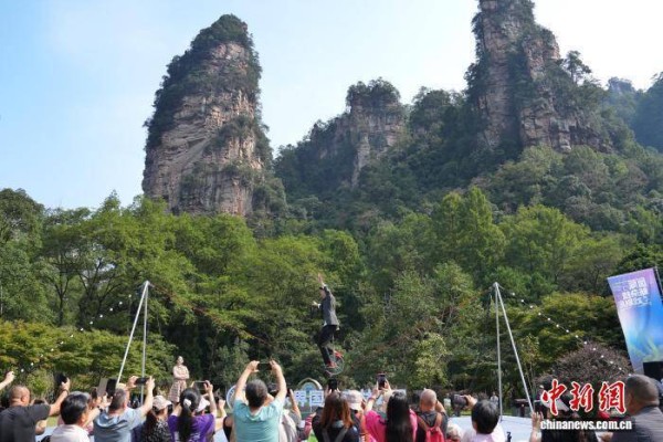 10月12日,在湖南张家界举行的2025张家界国际新杂技戏剧周上,来自俄罗斯、德国、智利等国家和地区的演员在峰林中表演杂技,杂技动作与奇峰景观相融合,吸引众多游客围观。图为来自智利的演员表演杂技《踉跄》。中新社记者 杨华峰 摄