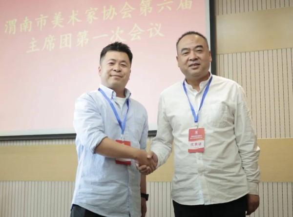 ▲渭南市美协主席党宽阳(右)与新当选副主席华凯(左)