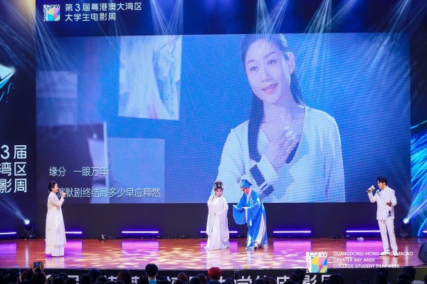 当天下午,著名演员、电影周艺术顾问张颂文为青年电影人送上真挚寄语,鼓励大家勇敢追梦,用镜头记录时代,用光影传递青春力量。著名粤剧演员曾小敏与暨南大学澳门籍学生李洋乐一同演唱粤剧电影《白蛇传·情》推广曲《待你归来》,广东粤剧院一级演员杨静、玉龙倾情伴舞。传统戏曲与现代影视跨界融合,展现“一曲千般情,万象入戏来”的艺术魅力。