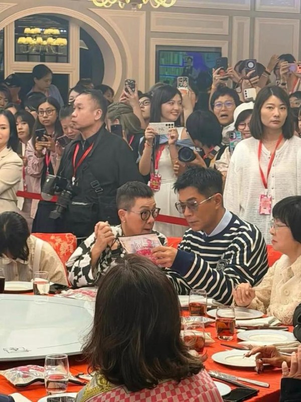 寿宴现场早已是熟客们的老地方:李琳琳、姜大卫等老牌港星与胡枫、杜燕歌等老友围坐闲谈,香港小姐邵初与名厨三姐穿梭席间,而全国各地赶来的粉丝占了近半数席位。比起前年 40 桌、去年 60 桌的规模,今年 50 桌的排布更显温馨,古天乐穿着条纹卫衣内搭蓝色衬衫,卡其色休闲裤衬得身形依旧挺拔,笑着给每桌敬酒,丝毫看不出疲惫。