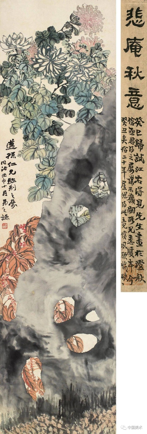 画则由近人任渭长而上溯南田、徐青藤、陈白阳,更以篆籀草行之法入画,自创雄迈清隽之一代新风,为海派艺术开辟了广阔的天地。
