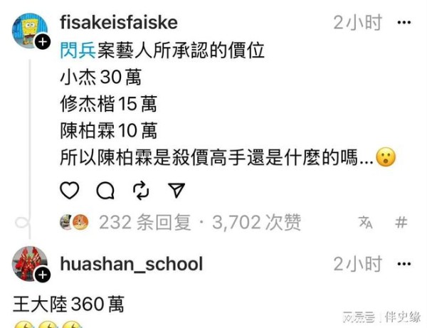 360万?难道是王大陆比较火?看到有修杰楷我可以这样认为,但王大陆绝不可能比陈柏霖还要火,也许是陈柏霖人脉好一手搞定,而王大陆需要经过四五道手。