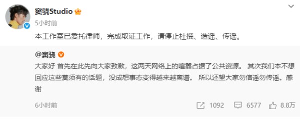 随后,窦骁工作室发布官方声明,称:“本工作室已委托律师完成取证工作”,要求相关方立即停止编造、传播不实言论。