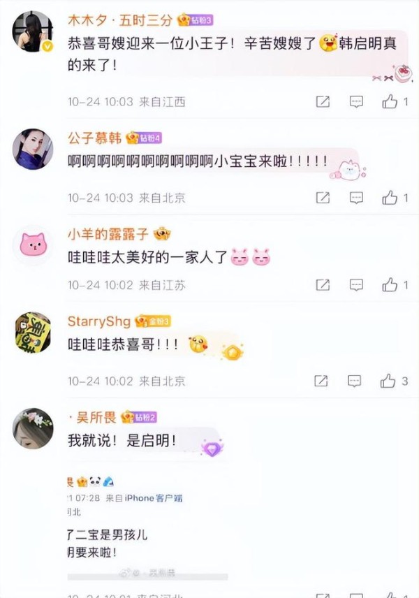 10月24日,韩庚在社交平台晒照,高兴地宣布妻子卢靖姗已顺利诞下二胎儿子!这真是个大好的“好”消息,一家三口变四口,幸福指数倍增。