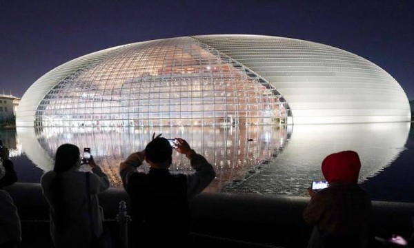 国家大剧院人工湖是《浮声之城》城市漫游路线的终点,观众在夜色中拍照留念。北京日报客户端记者 方非摄