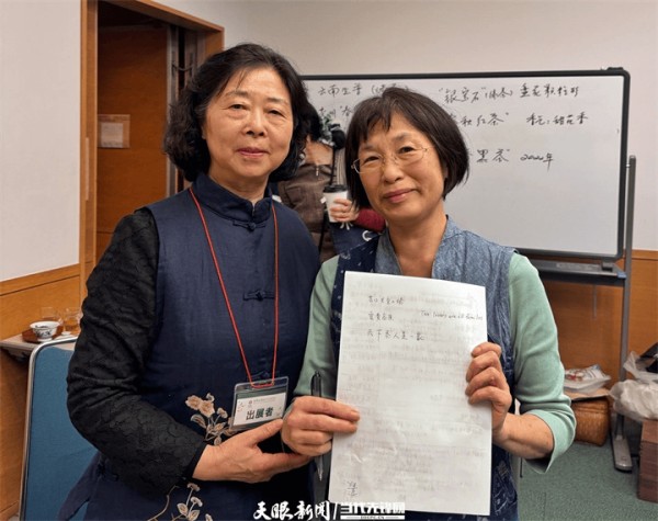 牟小玲(左)给“粉丝”写下“天下茶人是一家”