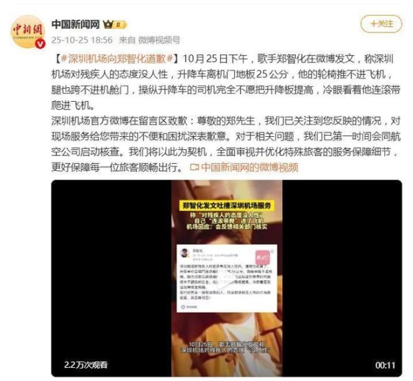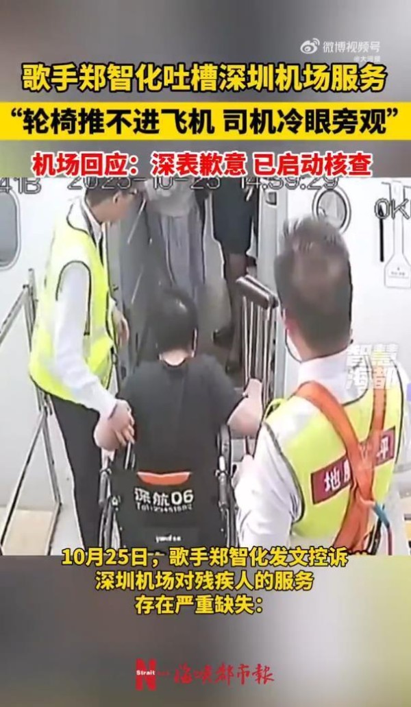 10月25日,郑智化在微博发文炮轰深圳机场对残疾人“最没人性”。他描述了一段狼狈的登机经历:机场升降车与机舱门存在25公分高度差,轮椅无法推进,自己腿部无力跨越,而司机拒绝调整设备,最终“冷眼看着我连滚带爬进飞机”。他强调,这一过程带来的心理伤害远大于身体不适。