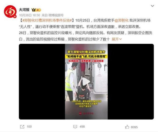 一则“连滚带爬”的控诉,让台湾残疾歌手郑智化和深圳机场一起被推上热搜,而随后流出的监控视频,更让这场争议彻底炸开了锅。