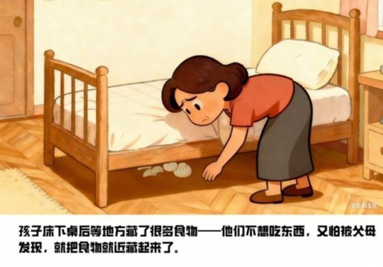 这类孩子还会有藏食的行为。“有的家长可能会发现,孩子床底下藏了很多食物——孩子不想吃东西,怕被父母发现,就把食物给藏起来了。”陈超说。