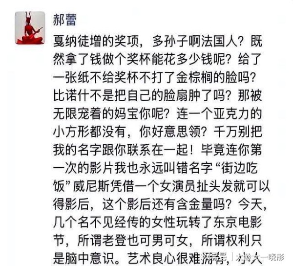 郝蕾的发声,直白而尖锐,似乎不仅仅是在指向某一位导演或一部影片,而是对整个奖项评选机制的质疑。