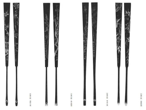 此处顺便讲到,江寒汀在苏州碰到的谭维德是竹刻名家,不知道日后江寒汀对竹刻颇多研究是否有此缘由,像盛丙云、支慈庵、孙更贯等竹刻名家都和江寒汀有所交往,虽然现有文字资料没有显示他与金西厓有直接往来的记载,但是存世有不少江寒汀起稿,金西厓刻的扇骨,推断两人或许有过往来。而且江寒汀的女婿李卓云也善于竹刻,正是出于江寒汀的指点,先教李卓云“取进口洋伞钢骨一段,自己淬火打磨,制成一把尖刀,一把圆刀,一把弯槽刀,还有单锋短刃他画上花鸟虫鱼……运用刀法也都详细指点。另外他还要求我用钉被的大针,断去针头,制成一把特小的刻刀,专刻工细的”。