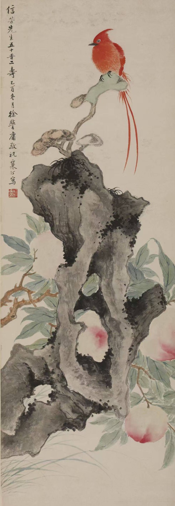 1945年应朋友所请为周信芳五十二岁生日作《桃芝眉寿图》