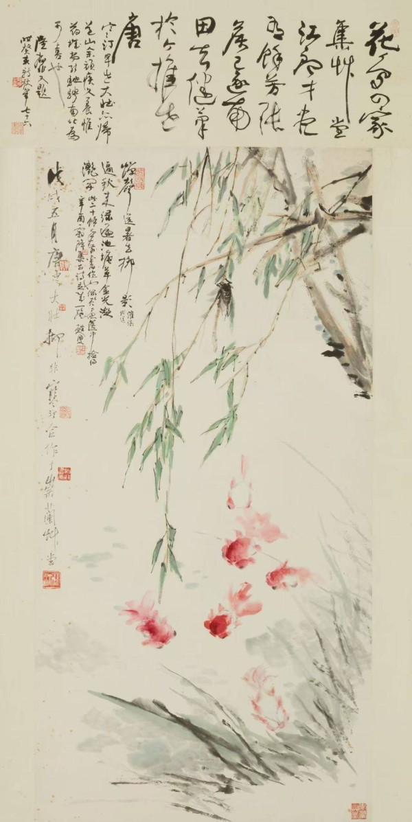 1958年唐云、张大壮、陆抑非、江寒汀“四花旦”合作《秋柳金鱼图》