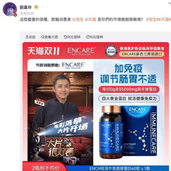 今日,演员刘嘉玲在微博公开指控淘宝和天猫平台存在严重侵权行为。原因疑似是某商家在平台销售的保健品擅自使用梁朝伟肖像进行虚假宣传,虚构其代言身份。