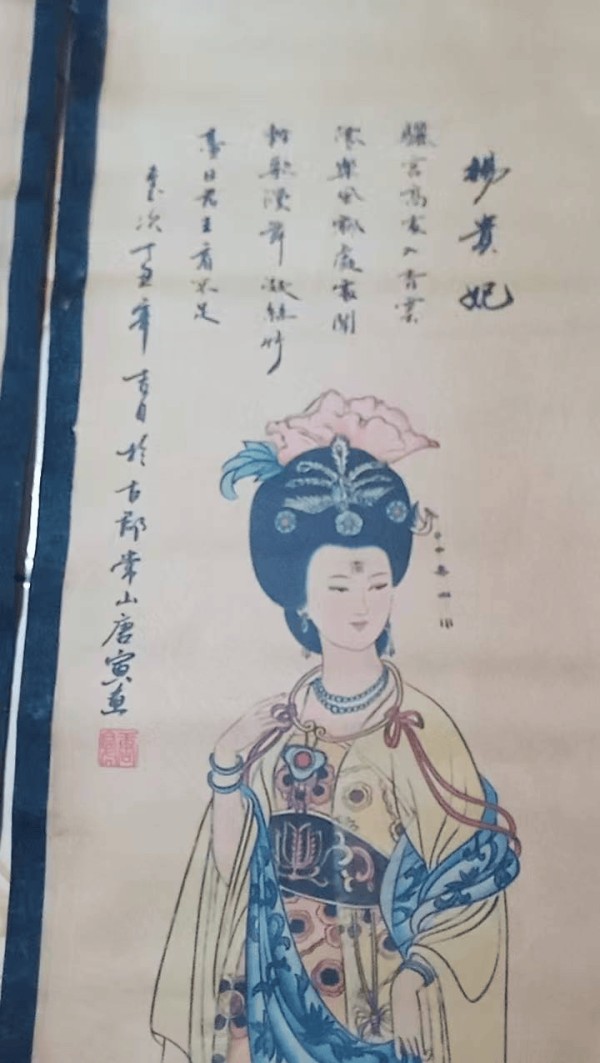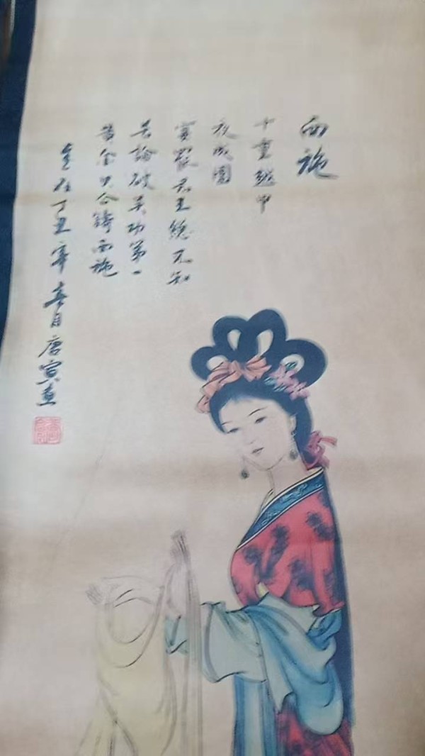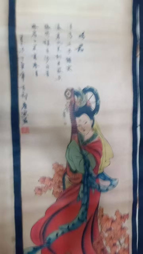 在作画手法上,唐寅的这组四条屏充分展现了其“院体笔墨,文人意趣”的融合与超越。他早年曾受到宋代院体画风的影响,工笔细腻,设色艳丽。然而,在经历人生坎坷后,他的画风融入了更多元代的笔墨韵味与文人的写意精神。具体到这组美人图上,我们可以观察到几个显著特点。首先,在线条的运用上,他继承了唐代以来人物画“高古游丝描”的遗韵,线条流畅飘逸,如春蚕吐丝,精准地勾勒出女子柔美的体态、飘逸的衣带和错综复杂的的发髻。衣裙的褶皱处理,既富有质感,又极具韵律感,仿佛随风而动。其次,在设色上,他并非一味浓艳,而是善于运用清雅与明丽相结合的色调。美人面部敷色温润,体现出“三白法”(额、鼻、下颌施白粉)的明代审美特征,衣衫则可能以石膏、石绿、朱砂等矿物或植物颜料渲染,既华贵又不失文雅。再次,也是最为精妙之处,在于他对人物神韵的捕捉。唐寅笔下的四大美女,不再是概念化的符号,而是各有其态,各具其神。他通过微妙的面部表情、眼神的方向、以及身姿动态,生动地传达出西施的淡淡哀愁、昭君的思乡离愁、貂蝉的机敏聪慧与杨贵妃的雍容娇媚。背景的处理往往简练而富有意境,或许是一隅山水,几枝花草,或是一案一扇,既点明了环境,又绝不喧宾夺主,充分保留了画面的文人书卷气。加之画面上通常配有他潇洒秀逸的书法题诗,诗书画印相得益彰,共同构建了一个完整的、充满诗意的审美空间。