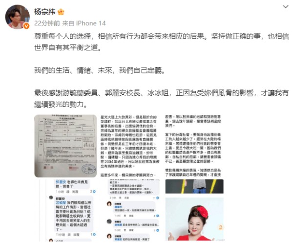 近日,杨宗纬被曝是恶邻引发网友热议。11月20日晚,杨宗纬在社交平台上发出报案回执,“尊重每个人的选择,相信所有行为都会带来相应的后果。坚持做正确的事,也相信世界自有其平衡之道。我们的生活、情绪、未来,我们自己定义。”最后,杨宗纬还感谢了为自己发声的朋友们。