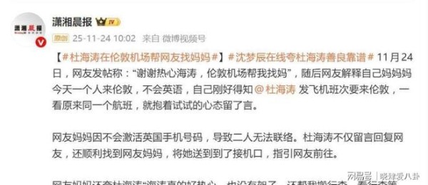 11月24日,有一位网友发帖称要感谢热心的杜海涛在伦敦机场帮助他找妈妈。
