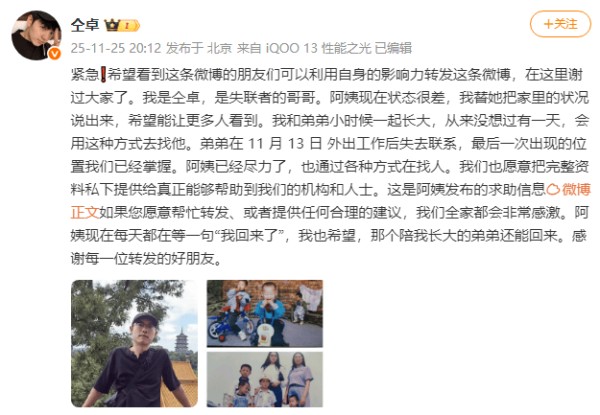 25日,仝卓在社交平台上发文向网友求助,称弟弟在柬埔寨失联!他表示:“紧急!我是仝卓,是失联者的哥哥。阿姨现在状态很差,我替她把家里的状况说出来,希望能让更多人看到。我和弟弟小时候一起长大,从来没想过有一天,会用这种方式去找他。弟弟在11月13日外出工作后失去联系,最后一次出现的位置我们已经掌握。阿姨已经尽力了,也通过各种方式在找人。我们也愿意把完整资料私下提供给真正能够帮助到我们的机构和人士。这是阿姨发布的求助信息,如果您愿意帮忙转发、或者提供任何合理的建议,我们全家都会非常感激。阿姨现在每天都在等一句‘我回来了’,我也希望,那个陪我长大的弟弟还能回来。感谢每一位转发的好朋友。”