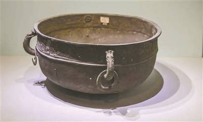 展览起始位置陈列了一件战国时期的蟠螭纹青铜鉴。展介中写道:“据推测,人们将水注入鉴内后,可以用平静的水面自视。”展出的铜鉴颈部微敛,弧腹,圈足。外壁饰三周蟠螭纹带,纹带间和圈足上各有一道绳纹,近口处有兽首形环耳。