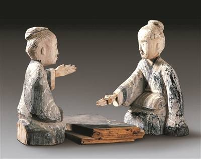其中的汉代彩绘木六博俑曾经出现在今春中国美术馆“墨韵文脉——甘肃丝路艺术珍品展”上:两人相向跪坐对弈,双方身板笔直,凝神静气,右侧木俑右手执棋,但眼神并未落于棋盘,而是注视对方;左侧木俑同样以眼神看向对手,左手上抬作邀请状。制作者用手势和平视的眼神表现对弈双方的君子姿态,让人印象深刻。