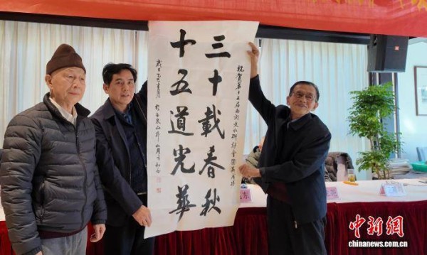 11月29日,浙江省钱江书画院副院长周和年(左一)向大会赠送“卅载春秋 十五道光华”题辞。 孙琳茹 摄