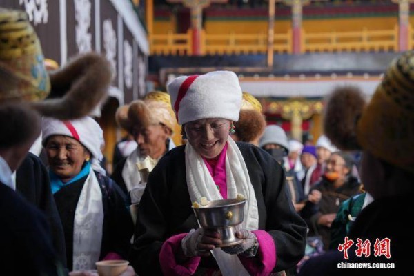 图为白拉姆节临近之际,信众在大昭寺内敬献供品后载歌载舞的场景。贡确 摄