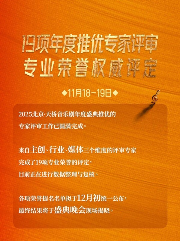 2025北京·天桥音乐剧年度盛典推优的专家评审工作已圆满完成,来自“主创”“行业”“媒体”三个维度的评审专家完成了19项专业荣誉的评定,目前正在进行数据整理与复核。