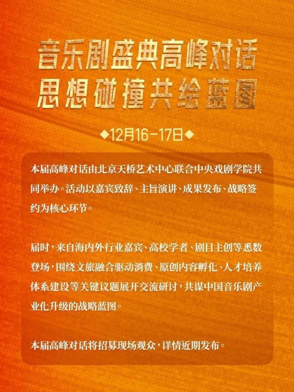 本届高峰对话由北京天桥艺术中心联合中央戏剧学院共同举办。活动以嘉宾致辞、主旨演讲、成果发布、战略签约为核心环节。届时,来自海内外行业嘉宾、高校学者、剧目主创等悉数登场,围绕文旅融合驱动消费、原创内容孵化、人才培养体系建设等关键议题展开交流研讨,共谋中国音乐剧产业化升级的战略蓝图。本届高峰对话将招募现场观众,详情近期发布。