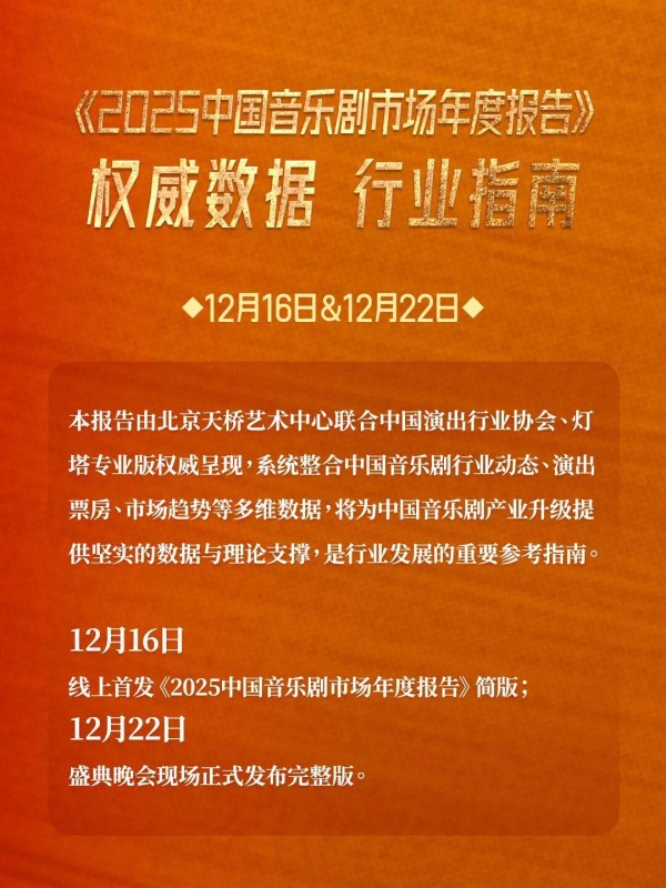 本报告由北京天桥艺术中心联合中国演出行业协会、灯塔专业版权威呈现,系统整合中国音乐剧行业动态、演出票房、市场趋势等多维数据,将为中国音乐剧产业升级提供坚实的数据与理论支撑,是行业发展的重要参考指南。12月16日,线上首发《2025中国音乐剧市场年度报告》简版;12月22日,盛典晚会现场正式发布完整版。
