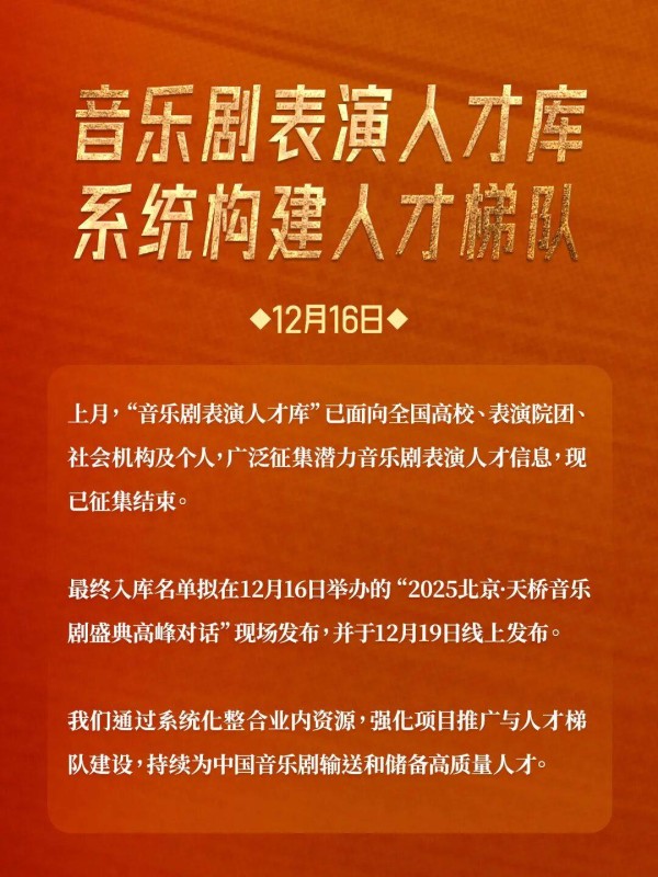 上月,“音乐剧表演人才库”已面向全国高校、表演院团、社会机构及个人,广泛征集潜力音乐剧表演人才信息,现已征集结束,最终入库名单拟在12月16日举办的“2025北京·天桥音乐剧盛典高峰对话”现场发布,并于12月19日线上发布。