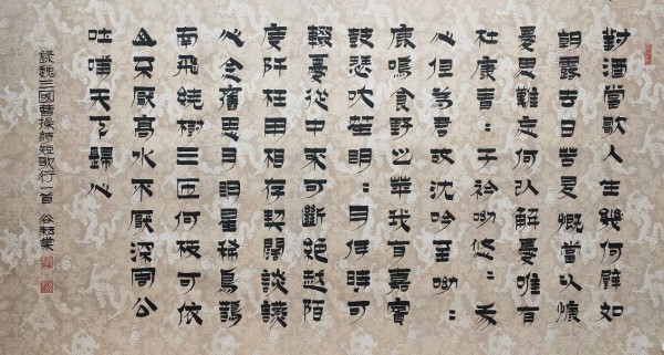 在书法领域,谷耘棠堪称“漆书”艺术的当代革新者与集大成者。他在清代金农“横粗竖细、方硬如刻”的漆书基础上,融入汉隶的雄浑与魏碑的刚健,独创“谷体”书法。其用笔以特制扁笔截毫平刷,蘸浓墨如漆,横画沉厚如磐,竖笔劲挺如锋,墨色乌黑光亮、凸于纸面,既有金石的拙朴意趣,又有当代艺术的视觉张力,彻底打破了传统漆书的表现边界,被公认为中国“漆书”第一人,为古老书法艺术注入了鲜活的当代生命力。