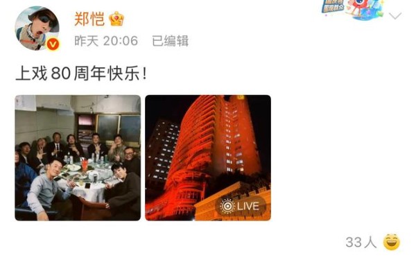 除了徐峥之外,郑恺也在个人社交账号中分享与同学一起聚餐庆祝“上戏”80周年校庆的画面,他们十几个人前去一家“苍蝇小馆”聚会,特别接地气。