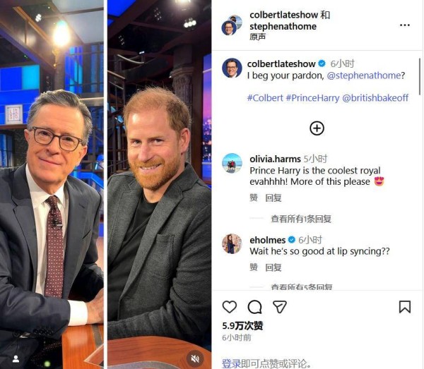 白金汉宫的窗帘微微颤动,梅根·马克尔在Instagram上轻轻一点,分享了一段丈夫哈里王子与美国脱口秀主持人斯蒂芬·科尔伯特对口型模仿《英国烘焙大赛》的搞笑视频。