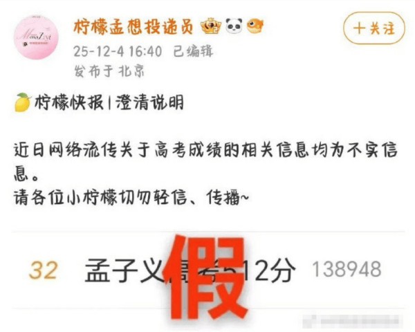 近日,网传孟子义高考成绩达512分,相关话题引全网热议。12月4日,孟子义方发声辟谣道:“近日网络流传关于高考成绩的相关信息均为不实信息。请各位小柠檬切勿轻信、传播。”