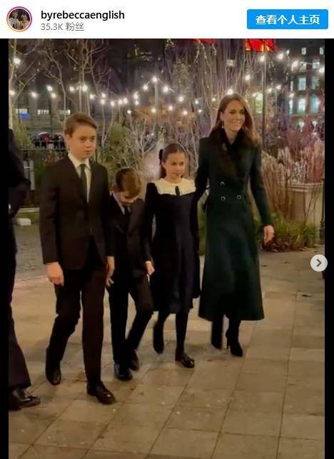 威廉王子携三个孩子——乔治王子、夏洛特公主和路易斯王子一同出席。肯辛顿宫在官方Instagram上发布的视频中,三个孩子跟着父亲步入教堂,表情既兴奋又带着些许紧张。