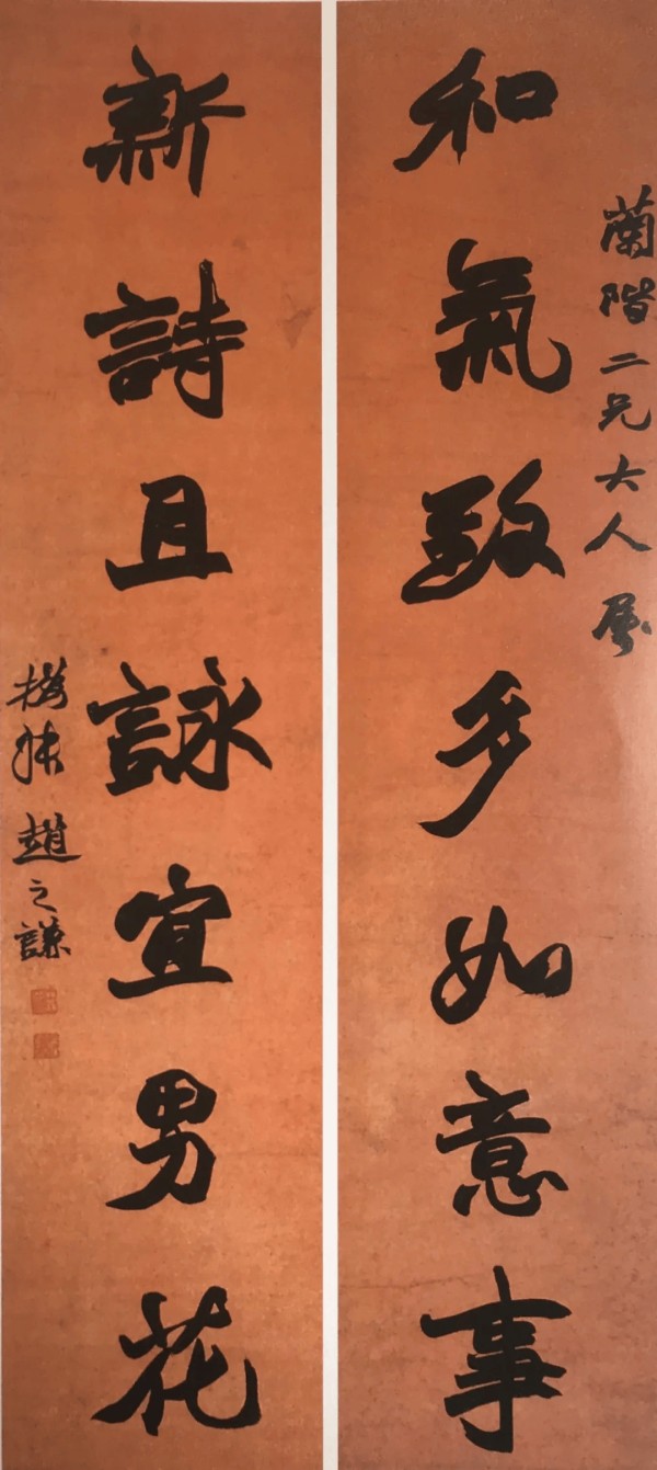 嘉道之际,随着阮元《北碑南帖论》尊碑思潮的兴起,颜真卿书法由于兼备碑帖两种特质而颇受青睐,一时习颜风气盛行,赵之谦也不例外,如其早年作品《岳忠武王华严院句》显然出于颜书。据其《章安杂说》 自述,后来他“见山谷大字真迹止十余,若有所悟,偶作大字,笔势顿异。 ”其笔势的确开张了许多,笔势开张后的审美趣味与魏碑更加接近,这为其后来的魏碑书法埋下伏笔。