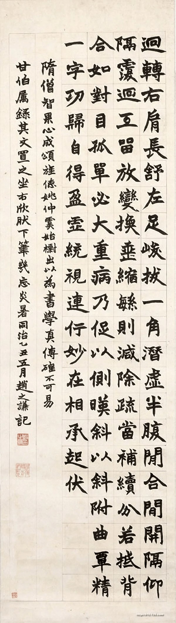 后来,赵之谦“一心开辟道路,打开新局 ”,其举措是研习北碑。据《府君行略》载, 在反复读了《南北书派论》后,“知北朝字体实由斯、邕而变,遂一意宗尚北书。”他对北碑的学习是先古后今、取法乎上的,自言“生平因学篆始能隶,学隶始能为正书,取法乎上,仅得其中 ”,并主张“先学秦、汉诸石刻,以立隶楷之基。 ”