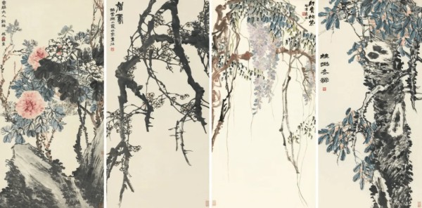 这种盛气凌人的图式,充分展现了画面的险绝之势,也为晚清以来的海上画派花鸟画的条幅构图提供了一种样式。