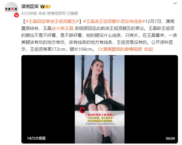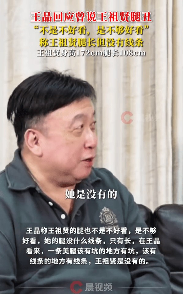 12月7日,王晶发视频回应曾说王祖贤腿丑的言论,他称对方腿不算难看但不够美,仅有长度却无线条,还表示美腿需有凹凸线条感,而王祖贤并不具备。公开资料显示,王祖贤身高172cm,腿长108cm。