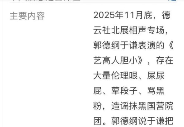 据悉,此事的起因,源于郭德纲、于谦在北展剧场表演的旧作——相声《艺高人胆小》,有观众举报其存在三方面问题: